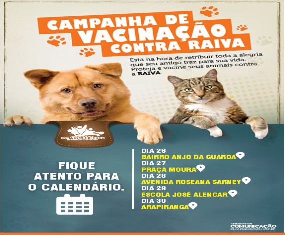Nesta segunda-feira, 16 de agosto, será iniciada a Campanha de Vacinação Antirrábica no município de Boa Vista do Gurupi. Até o dia 30 equipes de vacinadores estarão em diferentes pontos para vacinar cães e gatos e proteger os animais do vírus da raiva, que também pode afetar seres humanos.